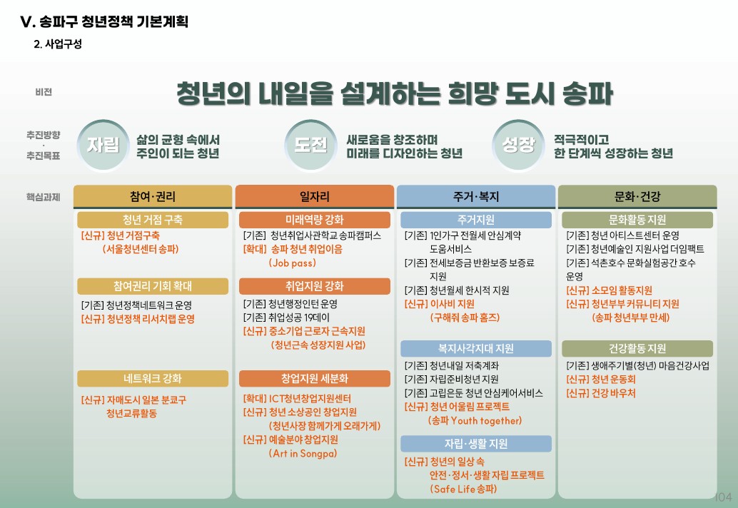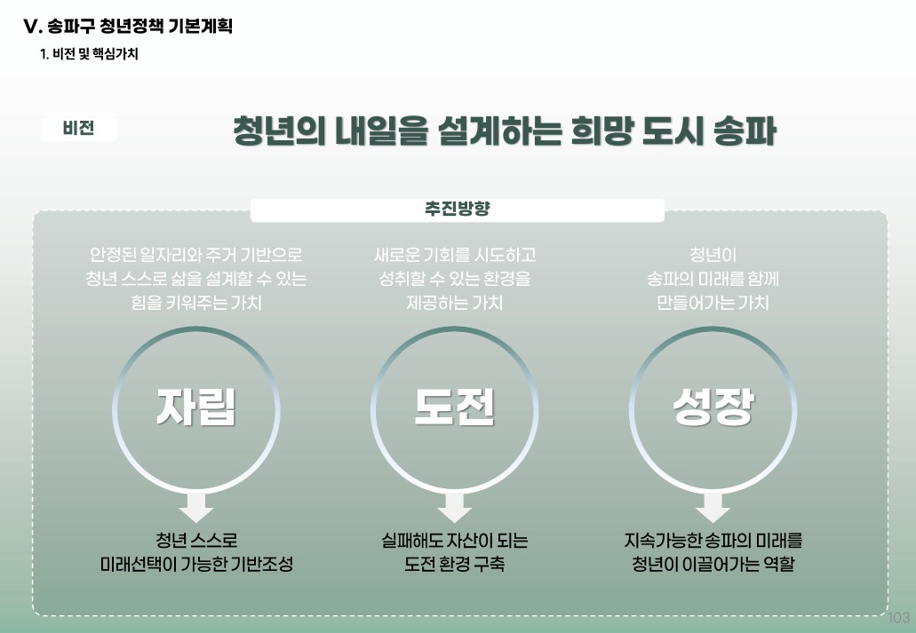 본 연구는 위와 같은 과정을 통해 이론적 배경과 외부 정책환경을 송파구의 내부 여건과 결합하여, 송파구 청년정책의 특성에 부합하는 기본계획을 도출하였습니다. 이는 ‘청년의 내일을 설계하는 희망 도시 송파’라는 비전을 중심으로, 청년의 자립과 도전, 건강한 일상, 지역과의 연결, 정책 참여와 협력을 포괄하는 방향을 담고 있습니다. 본 송파구 청년정책 기본계획이 정책 사각지대와 소외를 최소화하고, 청년의 다양한 삶의 유형을 존중하는 맞춤형 정책으로 확장되어 송파구 청년 누구나 정책에 참여하고 체감할 수 있는 지속가능한 정책 체계로 이어지기를 기대합니다.