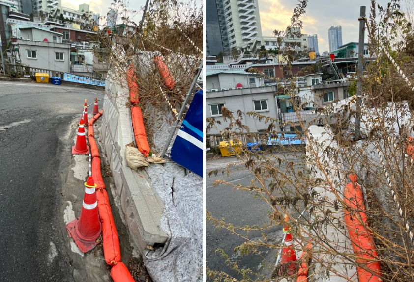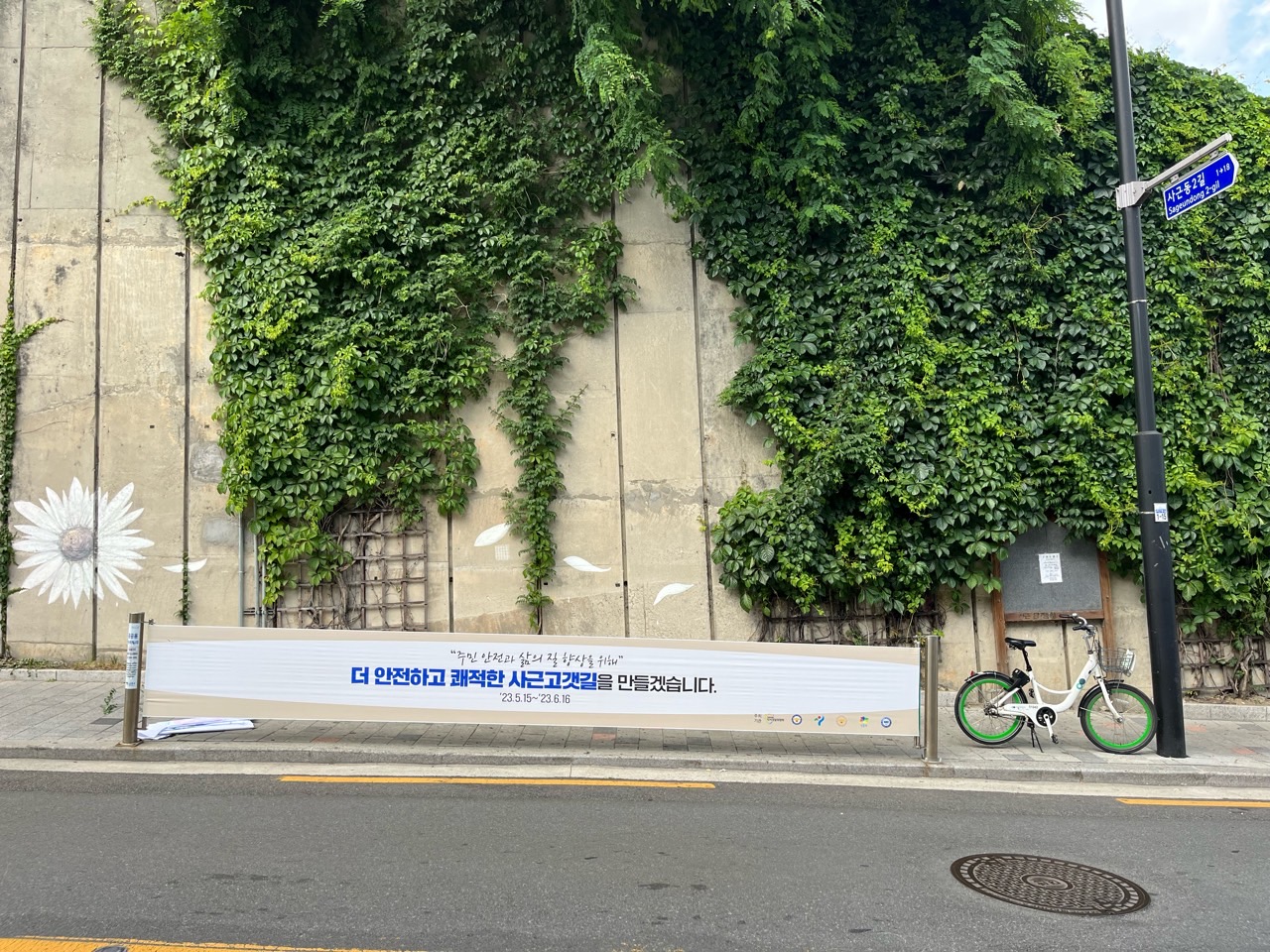 사근고갯길 옹벽은 대학가·주거밀집지의 주요 보행 동선에 위치해 많은 사람들이 오가는 구간임에도, 기능 중심의 노후 콘크리트 구조물로 인해 거리 경관이 단절되고 삭막한 인상을 강화하는 요인이었습니다. 또한 경사와 굴곡이 있는 길 특성상 보행자는 차량과의 혼재 구간을 지나야 했고, 야간에는 조도 부족으로 시야 확보가 어려워 심리적 불안과 안전사고 위험이 커질 수 있는 환경이었습니다. 더불어 옹벽의 오염·균열·낙서 등 노후화가 누적되면서 유지관리 부담이 지속적으로 발생했고, 주변 환경과 조화를 이루는 경관 개선과 함께 조명·식재·사인 등 설치 요소에 대한 체계적인 사후관리 기준 마련이 필요한 상황이었습니다.